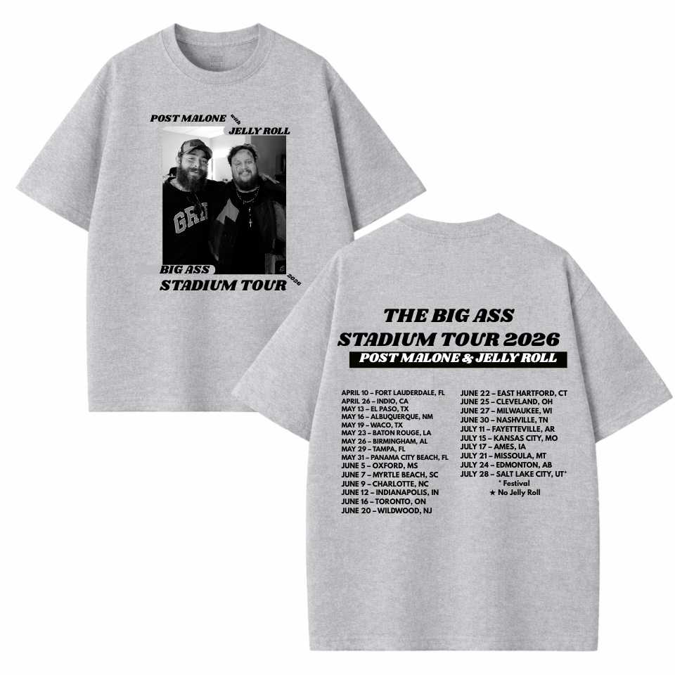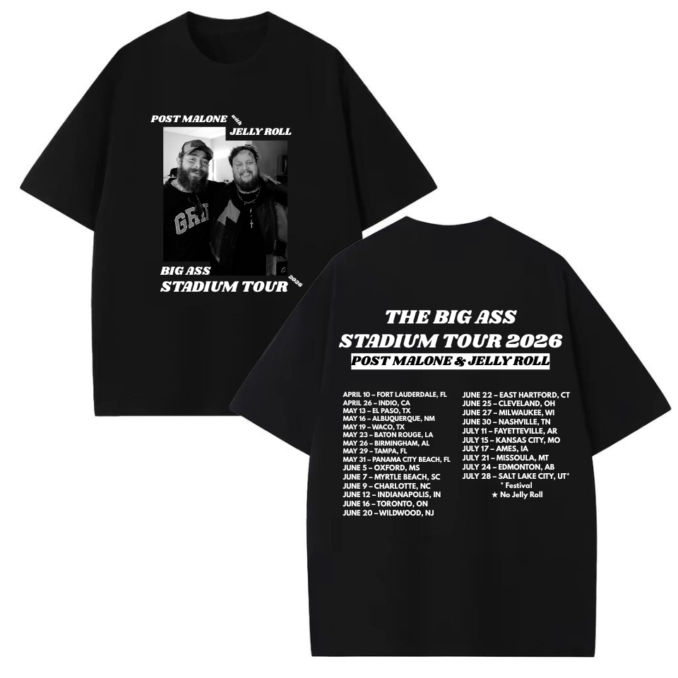 The Big Ass Stadium Tour Merch is the ultimate collection for fans of Post Malone, Jelly Roll, and their epic 2025 tour. Featuring a wide range of high-quality apparel, including sweatshirts, shirts, and hoodies, this merch line allows fans to celebrate the energy and excitement of the stadium tour in style. Each piece is designed with bold graphics inspired by live performances, making them perfect for concerts, casual outings, or everyday wear.