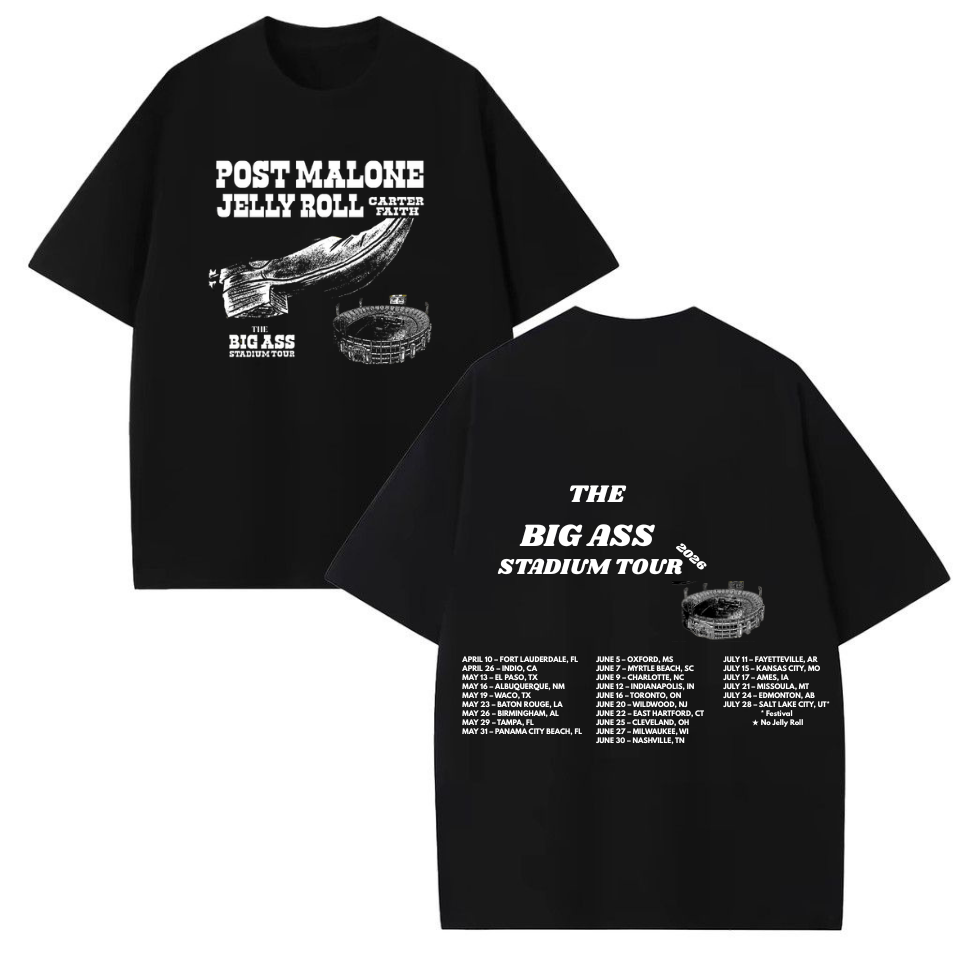Celebrate the energy of the Big Ass Stadium Tour with this must-have concert shirt, designed for fans who love bold style and iconic music merch. Inspired by the electrifying performances of Post Malone and Jelly Roll, this t-shirt features eye-catching graphics and a modern fit. Made from premium-quality fabric, it offers maximum comfort for concerts, casual outings, or everyday wear. Whether you’re attending the tour or collecting exclusive merch, this shirt is the perfect way to show your support. Upgrade your wardrobe with this trendy and limited-edition Big Ass Stadium Tour tee today.